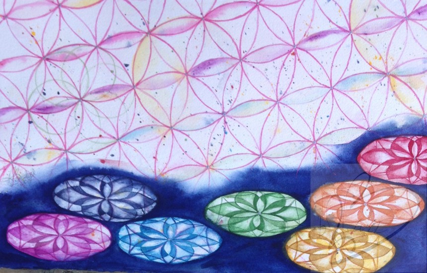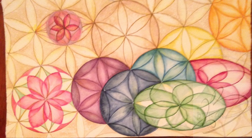 "Flowers” is 16” x 24" watercolor, on 140 lb. Cold Pressed Cotton Paper. Tumbling flower of life, falling at different angles creating...